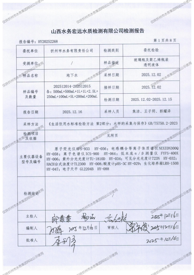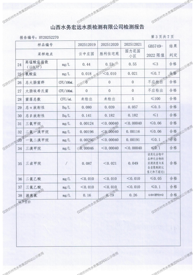 忻州城區(qū)公共供水水源水、出廠水、管網(wǎng)水、管網(wǎng)末梢水2025年12月份水質(zhì)信息公示