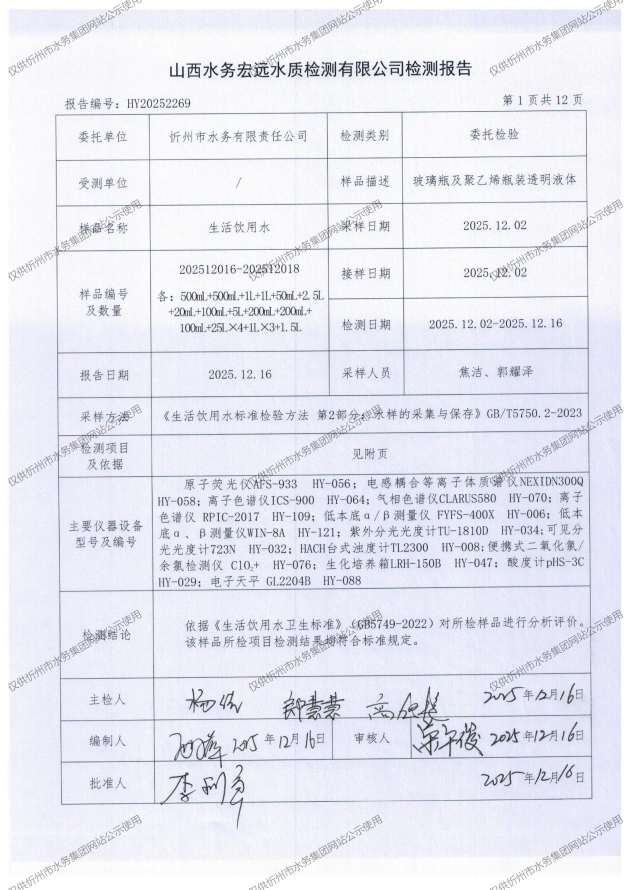 2025年忻州城區(qū)公共供水南水廠、三水廠、云中水廠出廠水97項水質(zhì)全分析