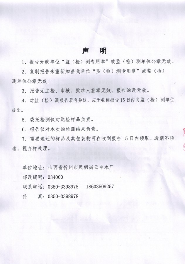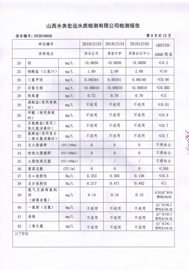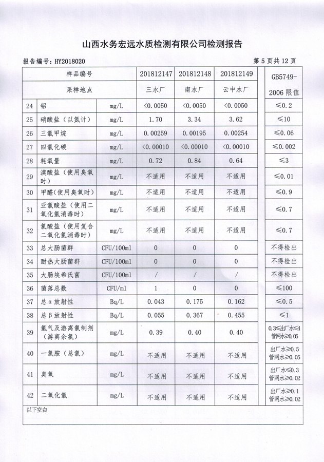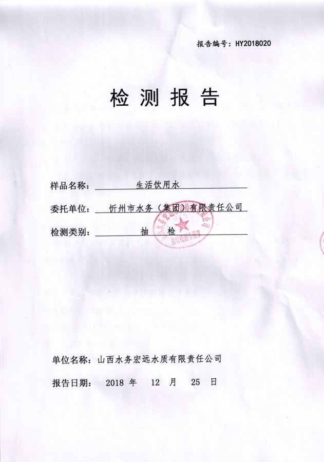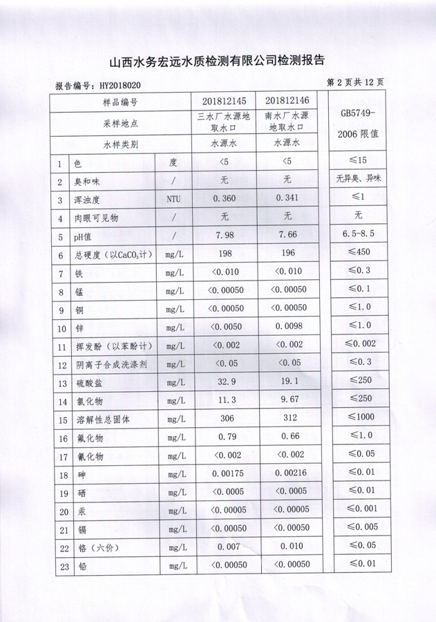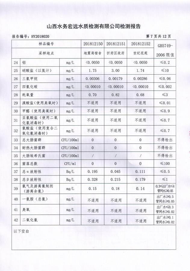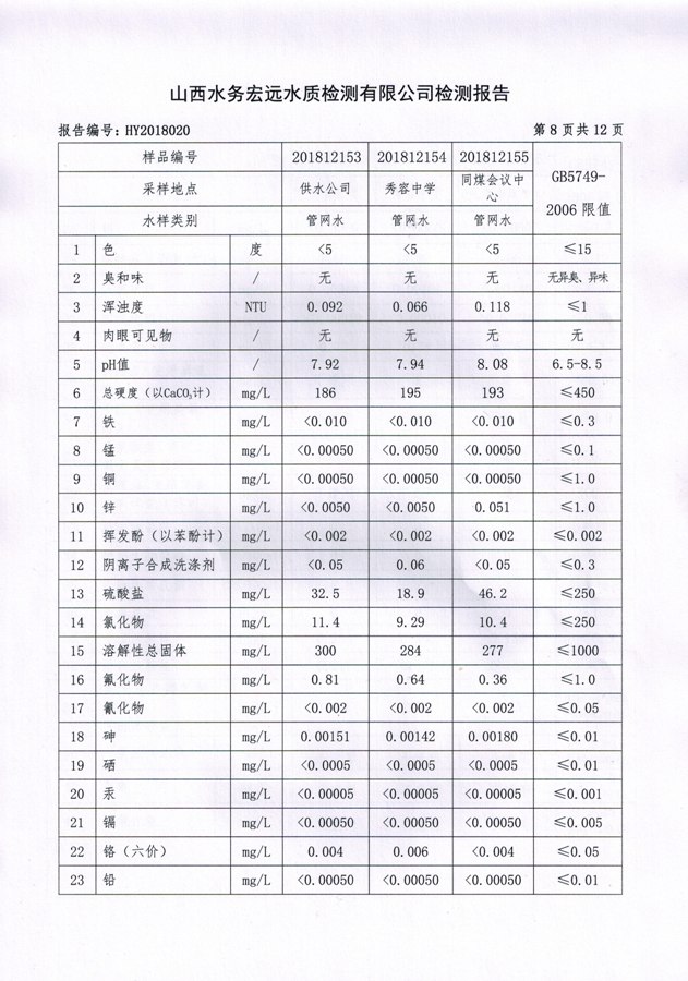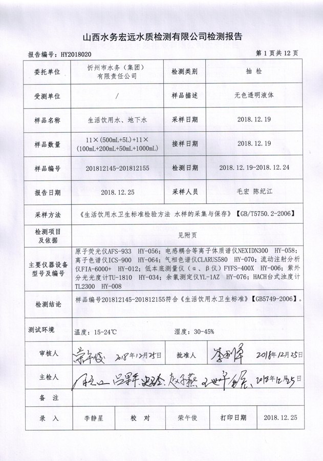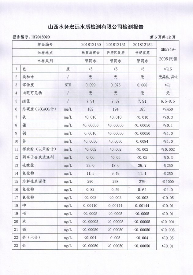 忻州城區(qū)公共供水水源水、出廠水、管網(wǎng)水、管網(wǎng)末梢水2018年12月份水質信息公示