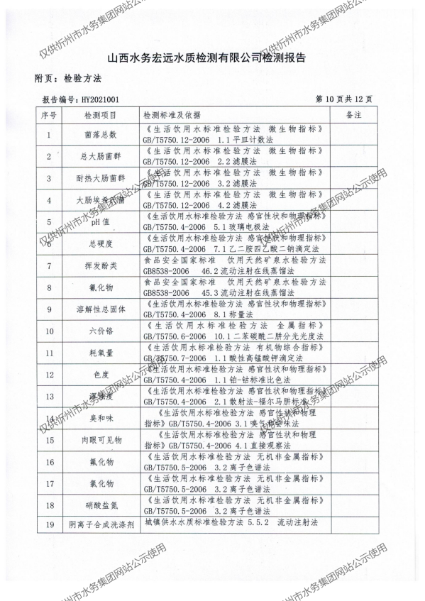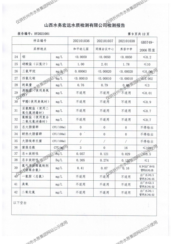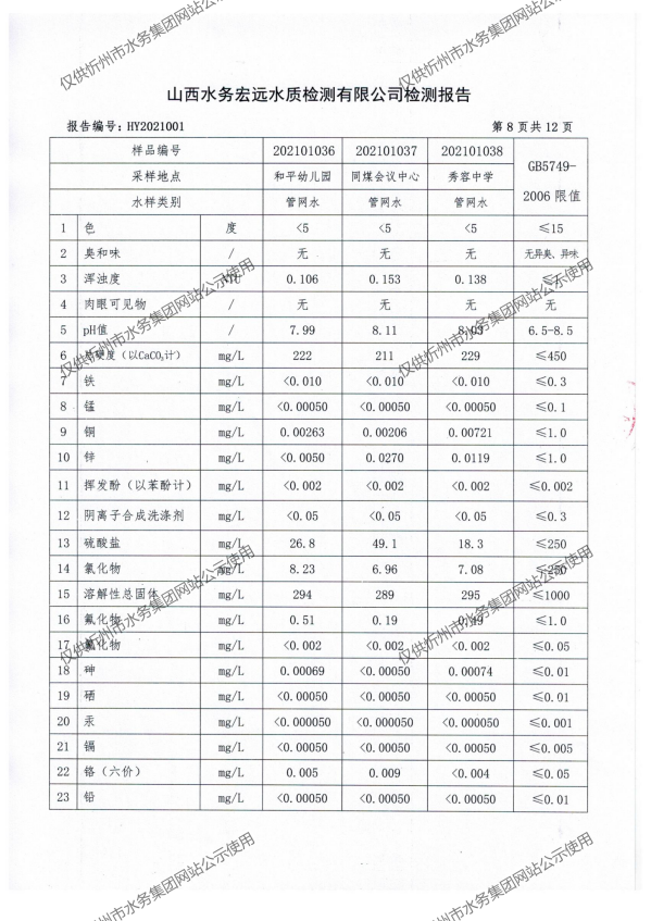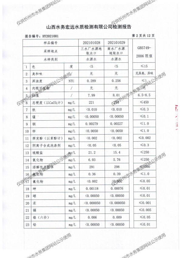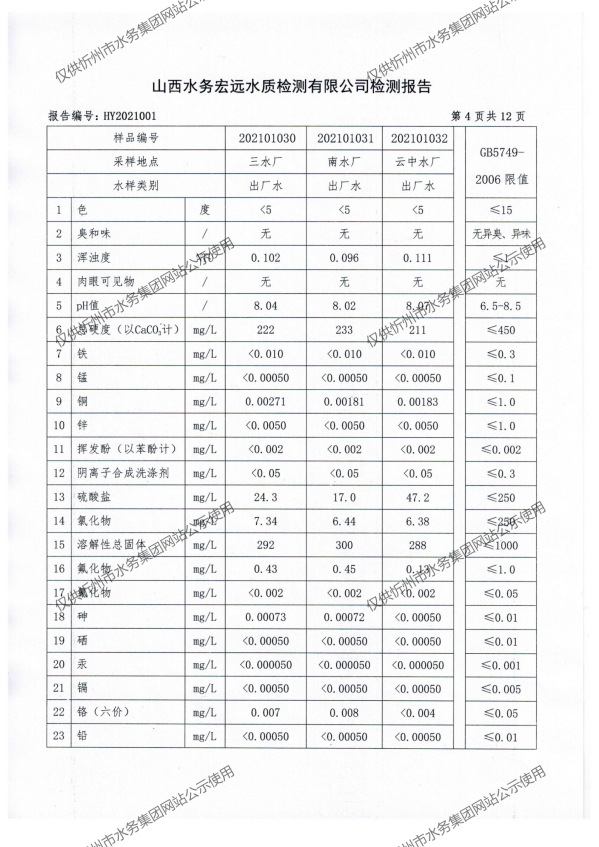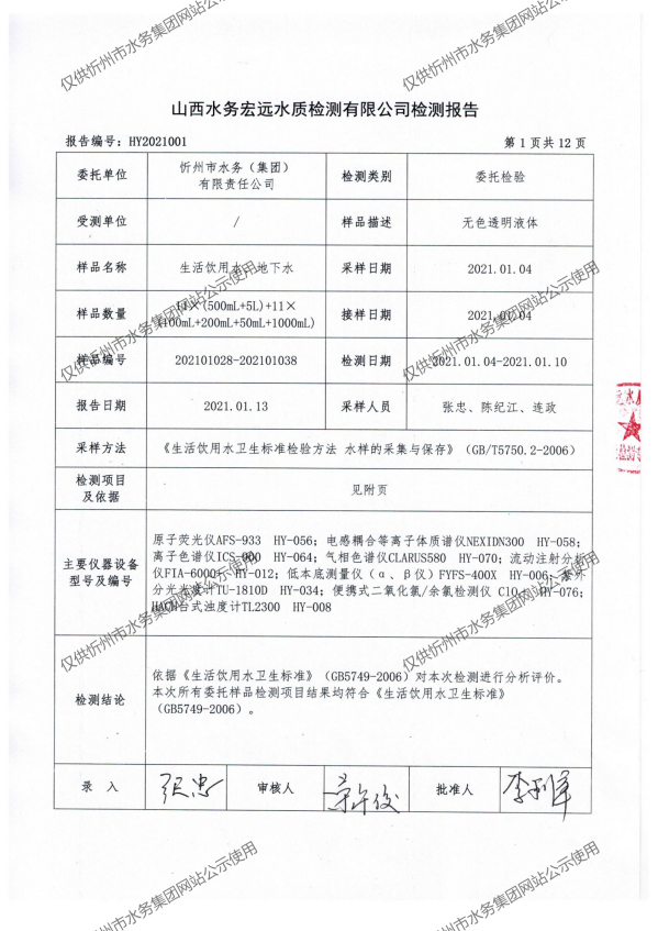 忻州城區(qū)公共供水水源水、出廠水、管網(wǎng)水、管網(wǎng)末梢水2021年1月份水質(zhì)信息公示